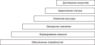 Исходным условием, объективной основой и конструктивным инструментом мотивации является процесс возникновения, становления и развития сознания индивида как формирование потенциала его самоорганизации. В этом смысле самоорганизацию индивида можно квалифицировать как целенаправленную и осознанную систематизацию его восприятия, осуществляемую на основе аналитической умственной деятельности по упорядочиванию представлений и овладению действиями. Под этим подразумеваются исследование и формирование представлений индивида, направленных на самого себя, осмысление и обеспечение удовлетворения собственных потребностей, накопление и развитие необходимых знаний, оценку личных качеств и овладение организационными навыками, обогащение культурой общества, достижение определенного уровня развития личности, получение и закрепление социального статуса. Этот процесс можно представить в виде шести соответствующих стадий самоорганизации, формирующихся с возникновением сознания индивида и последовательно осуществляющихся и развивающихся на протяжении всего жизненного цикла (рис. 4.2.1).
