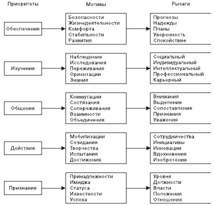 Исследование, совершенствование и использование индивидуального спектра мотивов побуждения конкретного работника к запланированному действию является важнейшей задачей современного менеджера. Ее успешное решение во многом зависит от полного и всестороннего позиционирования комплекса последовательности приоритетов, мотивов поведения работника и рычагов их использования. В самом общем виде модель содержания и классификации такого комплекса представлена на рис. 4.1.1. Данная модель агрегирует пять приоритетов мотивов поведения работника в соответствии с последовательностью реализации его основных потребностей. При этом действие одного из мотивов каждого приоритета раскрывается возможностью применения определенной палитры конкретных рычагов, универсально обеспечивающих осуществление мотивации личности в рамках единой социальной архитектоники и содержание данной модели существенно отличаются от чаще всего рассматриваемых социологами и психологами конфигураций, например, "потребностей по Маслоу", поскольку отражает организационный подход к представлению палитры, содержания и последовательности формирования и развития мотивации работника. Им обеспечивается не только и не столько классификация мотивов поведения, сколько их органичная преемственность, взаимосвязь, группировка и взаимодействие со стимулами на основе действия универсальной системы рычагов мотивации.