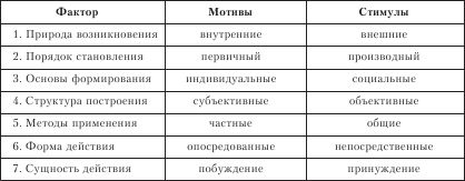 Формирование и практическое применение мотивов и стимулов тесно взаимосвязаны, что иногда допускает смешение этих понятий. Между тем, содержание и последовательность их возникновения, формирования, становления, развития, применения и взаимодействия известны с древних времен и представляются в четко формализованном виде, наиболее полно отражаемом следующим сравнительным анализом основных факторов их проявления (табл. 4.3.1).