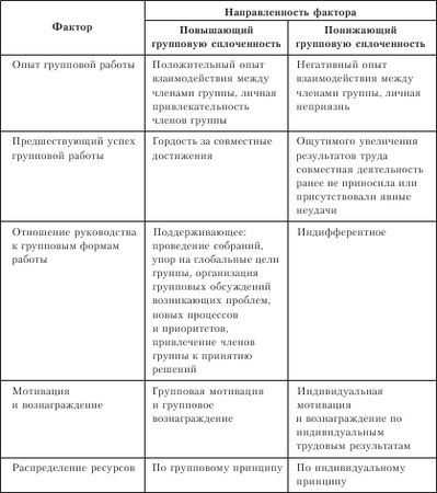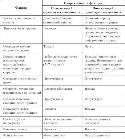 На групповую сплоченность оказывают влияние различные факторы, которые могут как повышать ее, так и существенно ее снизить (табл. 5.2.2).