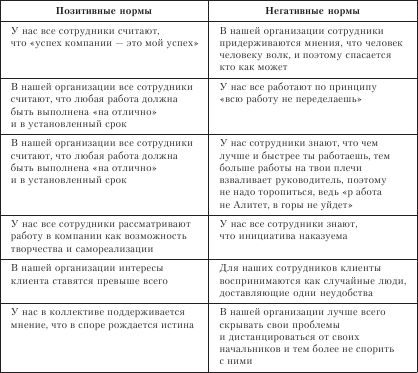 Нормы оказывают влияние и на результаты деятельности организации. Они могут быть положительными и поощрять поведение людей в направлении достижения целей организации. Отрицательные нормы, наоборот, поощряют поведение, не способствующее достижению целей организации (табл. 5.2.1).