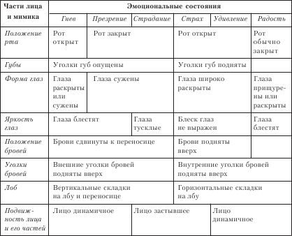 Мимика – движения мышц лица (табл. 7.3.3). В специальной литературе встречается более 20000 описаний выражения лица. Следует отметить, что главной характеристикой мимики выступает ее целостность и динамичность. В мимическом выражении шести основных эмоциональных состояний: гнев, презрение, страдание, страх, удивление, радость – все движения лица скоординированы.