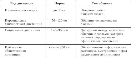 Пространство выступает в качестве особой знаковой системы и несет смысловую нагрузку. Одним из первых пространственную структуру общения стал изучать американский ученый Э. Холл. Он же и ввел термин "проксемика" (от англ. proximity– близость). Это та дистанция, которую соблюдают люди при общении (табл. 7.3.5).