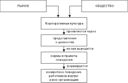 Корпоративная культура относится к факторам внутренней среды. На ее формирование большое влияние оказывает внешняя среда, в том числе макроокружение – общество и рынок. Процесс формирования культуры связан с установлением определенного типа отношений между членами организации. Это путь нахождения способов современной работы и сосуществования. Происходит формирование ценностей, традиций, устанавливаются нормы и правила поведения, ритуалы, системы коммуникации, язык общения, системы мотивации, т. е. формируется конкурентное поведение работников внутри организации (рис. 8.2.3). Причем главная роль в процессе формирования культуры отводится руководителю.