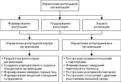 Управление репутацией внутри организации предполагает формирование корпоративного кодекса поведения, разработку ее философии, концепции, имиджа первых лиц, моделей привлекательного клиентурного поведения (см. также главу 12).