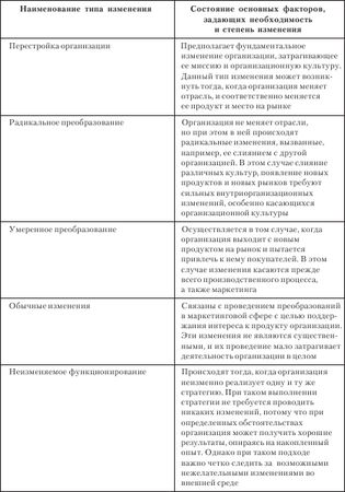 Типы изменений варьируются в зависимости от их глубины: от неизменяемого функционирования до перестройки организации, когда происходит ее фундаментальное изменение. Каждый тип изменения обусловлен изменениями, происходящими во внешней среде организации, а также сильными и слабыми сторонами самой организации.