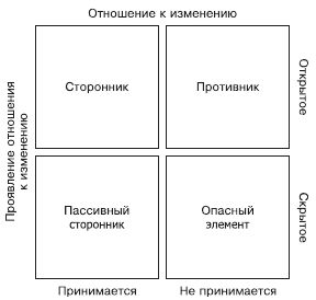 Важно не только провести анализ поля сил, но выявить и классифицировать отдельных работников организации по отношению к проводимым изменениям – являются ли они их сторонниками или противниками. Анализ потенциально возможных сил сопротивления позволяет выявить отдельных членов организации или же те группы в организации, которые будут оказывать сопротивление изменениям, и уяснить их мотивы. Отношение к изменению может быть рассмотрено как комбинация двух факторов: