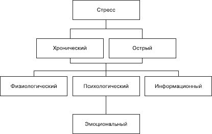 Хронический стресс предполагает наличие постоянной (или существующей длительное время) значительной нагрузки на человека, в результате которой его психологическое или физиологическое состояние находится в повышеном напряжении (длительный поиск работы, постоянная спешка, выяснения отношений). Острый стресс – состояние личности после события или явления, в результате которого у нее теряется "психологическое" равновесие (конфликт с начальником, ссора с близкими людьми). Физиологический стресс возникает при физической перегрузке организма (слишком высокая или низкая температура в рабочем помещении, сильные запахи, недостаточная освещенность, повышенный уровень шума). Психологический стресс является следствием нарушения психологической устойчивости личности по целому ряду причин: задетое самолюбие, незаслуженное оскорбление, несоответствующая квалификации работа. Кроме того, стресс может быть результатом психологической перегрузки личности: выполнение слишком большого объема работ, ответственность за качество сложной и продолжительной работы. Вариантом психологического стресса является эмоциональный стресс, который появляется в ситуациях угрозы, опасности, обиды. Информационный стресс возникает в ситуациях информационных перегрузок или информационного вакуума.