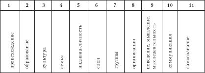 Вот определенный тип личности, с определенными чертами характера, детерминированными семьей (4-й столбец), его общей культурой (5-й столбец), образованием (6-й столбец), происхождением (7-й столбец), попадает в определенное место. Эта ситуация рисуется постановкой в кружок – место человека, который одной рукой крепко держится за место, а другой помахивает и делает вид, что ему на это место наплевать и он может ходить как угодно (табл. 10.3.1).