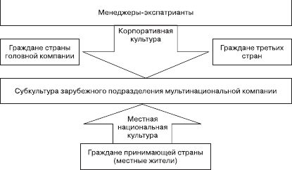 Безусловно, материнская компания оказывает влияние на нормы поведения сотрудников дочерних подразделений корпорации, расположенных в других странах. Однако персонал, в основном состоящий из местных жителей, является носителем национальной культуры и это не может не оказывать влияния на культуру дочерней компании. В результате приспособления организационной культуры к местным культурным особенностям в зарубежных подразделениях формируется так называемая "субкультура" (рис. 13.4.1).
