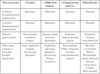 Различным странам в известной мере соответствует определенный тип организационной культуры, имеющий отличительные признаки и характеристики, например, различные соотношения формального – неформального, индивидуализма-коллективизма, долгосрочной-краткосрочной ориентации. Известен ряд классификаций типов, или моделей организационной (управленческой) культуры, предложенных различными учеными, среди которых получила признание типология, разработанная Ф. Тромпенаарсом и Ч. ХампденнТернером. В ее основе такие организационные характеристики, как степень централизации управления, степень формализации управления и целевая ориентация деятельности. Выделены четыре типа организационной культуры: "семья", "Эйфелева башня", "управляемая ракета", "инкубатор" (табл. 13.4.1).