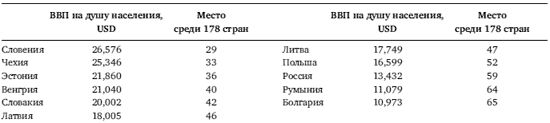 В книге почти нет данных о социально-экономическом развитии России и уровне жизни в ней. Мы их не приводили, полагая, что читатель неплохо осведомлен о том, какие в стране темпы экономического роста, какая инфляция и каковы размеры зарплат и пенсий. Но, чтобы у вас появился настрой на сопоставление догоняющей модели институциональной модернизации с недогоняющей, апеллирующей не к заграничным стандартам, а к национальным ценностям и традициям, некоторые сведения все же приведем. Вот как выглядели в 2007 году, по данным Международного валютного фонда, страны Новой Европы и Россия по такому показателю развития, как ВВП на душу населения.