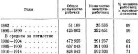 Они предпочитали оставить крестьян на месте, предоставив им возможность обрабатывать маленькие клочки земли за непомерно высокую арендную плату. С разрушением старой домашней промышленности и ростом перенаселенности деревни, последовавшим за отменой феодальных ограничений на рождаемость, а также с ростом современной фабрично-заводской промышленности, младшие члены семьи, в особенности женщины, покидали деревню и уходили в города в надежде пополнить своим заработком скудный доход семьи. Необходимо отметить, что увеличение численности сельской семьи, ее безвыходное финансовое положение, обостренное разрушением домашней промышленности, совпало с ростом текстильной промышленности, которая стала стержнем первой японской промышленной революции и являлась важнейшей отраслью японской промышленности, так как она производила продукцию для экспортной торговли. Такое положение позволило предпринимателям использовать на производстве труд женщин, пришедших из перенаселенной деревни, что в свою очередь вызвало снижение стоимости рабочей силы в текстильной промышленности. Это привело к созданию промышленного рабочего класса, большую часть которого составляли женщины. Следующая таблица показывает процент занятости женщин в промышленности[16]: