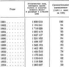 Если взять цифры об уменьшении числа лиц, пользующихся активным избирательным правом на выборах в префектуральные собрания (то есть лиц, которые платили поземельный налог в размере 5 иен и больше), а также лиц, имеющих право быть избранными на должности (то есть уплачивавших 10 и более иен налога в год), то хотя эти цифры и не дают нам представления о росте числа арендаторов, они свидетельствуют о неуклонном ухудшении положения мелких и средних крестьян-собственников, подготовившем почву для экспроприации крестьян. Эти сведения дают нам таблицы на стр. 160.