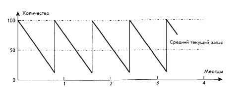 Рассмотрим движение запаса товаров в самом простом варианте. В течение месяца продается 100 каких-либо товаров. В конце месяца запас мгновенно пополняется, и цикл повторяется. В данном случае минимальный запас равен 0, максимальный – 100 шт., средний – 50 шт. Средний текущий запас является важным показателем для контроля запасов, он определяет среднюю величину средств, вложенных в запасы, и среднюю стоимость их содержания.