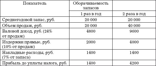 Получить точную картину средней оборачиваемости можно, только выявив и те, и другие. После избавления от этих запасов оборачиваемость возрастает. При увеличении оборачиваемости возрастают объем реализации и прибыль. Стоимость содержания запасов на складах растет из года в год вследствие инфляции, роста стоимости аренды помещений, расходов на заработную плату, накладных расходов и т. д., что вызывает естественное стремление снизить уровень запасов за счет более частого заказа товаров меньшими партиями. Зависимость увеличения прибыли от ускорения оборачиваемости показана в таблице. Увеличение оборачиваемости вдвое увеличивает прибыль втрое.