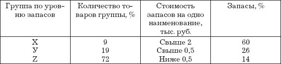 Из таблиц видно, что на 12 % номенклатуры товаров приходится 82 % товарооборота в стоимостном выражении, а на группу товаров, составляющую 9 % всей номенклатуры, – 60 % стоимости запасов. Этот факт имеет огромное значение – основной контроль нужно сконцентрировать лишь на той номенклатуре товаров, которые обеспечивают основную долю товарооборота. Аналогично, установив номенклатуру товаров группы X, сосредоточивают внимание на тех товарах, которые составляют основную часть стоимости запасов.