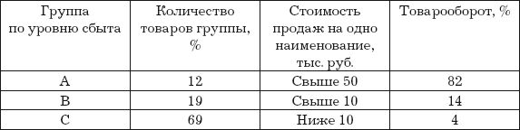 Если желательно подразделить запасы более чем на две классификационные группы, то нередко прибегают к известной системе "анализа ABC". По этой системе запасы подразделяются на группы А, В и С. Группа А объединяет наиболее активные виды запасов, В – запасы средней активности и С – запасы с наиболее низким уровнем активности. Для классификации по группам А, В и С применяют тот же метод, что и при объемно-стоимостном анализе. Товары располагаются по убывающей активности продаж. Группа А, как наиболее активная, подвергается самому тщательному контролю, группе В оказывается меньше внимания, а группа С контролируется наименее активно.