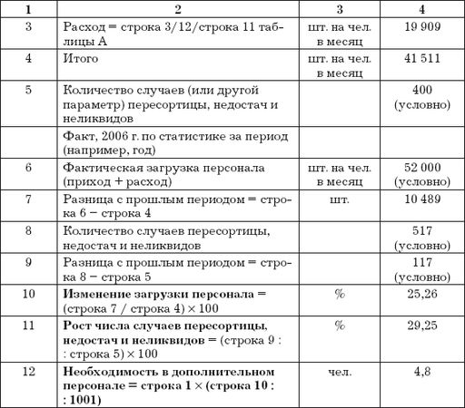 Пополнение штата складских работников Используя данные таблицы А, можно провести анализ объема работ персонала и рассчитать необходимый штат при увеличении товарооборота (табл. В). Например, учитывая данные за 2005 г., можно рассчитать загрузку персонала на последующие квартал, полгода или год с необходимой корреляцией объема грузов на каждый период. Причиной увеличения штата послужит разница в объемах работ, если такая разница выявится в процессе анализа. Из расчета в таблице видно, что рост загрузки персонала (строка 7) на 25 % вызвал рост числа ошибок (строка 11), следовательно, производительность труда на пределе и выход только в увеличении штата.