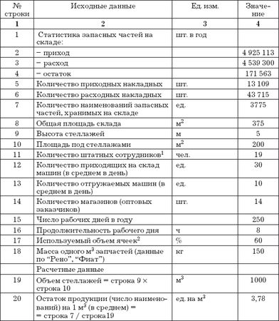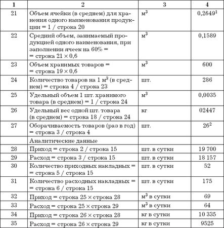 1 Объем ячеек 0,25 м3 на 1 наименование в упаковке является средним расчетным параметром при проектировании зоны хранения мелких деталей, а объем ячеек = 0,5 м3 на 1 наименование является средним расчетным параметром при проектировании зоны хранения мелких и средних деталей, кроме кузовных и шин. Это значит, что резерва для увеличения количества ячеек нет. 2 Такая оборачиваемость означает хранение товаров для двухнедельной потребности реализации.
