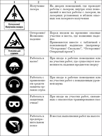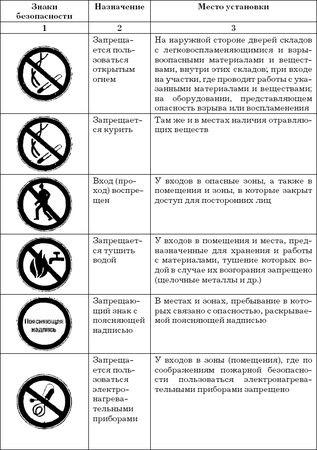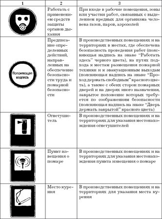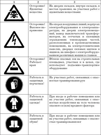 Работодатель обязан обеспечить информирование работников о полагающихся им средствах индивидуальной защиты, организовать надлежащий учет и контроль за выдачей работникам средств индивидуальной защиты в установленные сроки. Во время работы работники, профессии которых предусмотрены в Типовых отраслевых нормах, обязаны пользоваться и правильно применять выданные им средства индивидуальной защиты, а работодатель должен принимать меры к тому, чтобы работники во время работы действительно пользовались выданными им средствами индивидуальной защиты. Работники не должны допускаться к работе без предусмотренных в Типовых отраслевых нормах средств индивидуальной защиты, в неисправной, неотремонтированной, загрязненной специальной одежде и специальной обуви, а также с неисправными средствами индивидуальной защиты. Работодатель при выдаче работникам таких средств индивидуальной защиты, как респираторы, противогазы, предохранительные пояса, должен обеспечить проведение инструктажа работников по правилам пользования и простейшим способам проверки исправности этих средств, а также тренировку по их применению. Работодатель обязан обеспечить регулярное в соответствии с установленными ГОСТ сроками испытание и проверку исправности средств индивидуальной защиты (респираторов, противогазов, предохранительных поясов и др.), а также своевременную замену фильтров, стекол и других частей с понизившимися защитными свойствами. После проверки на средствах индивидуальной защиты должна быть сделана отметка (клеймо, штамп) о сроках последующих испытаний. Работодатель организует хранение и надлежащий уход за средствами индивидуальной защиты (своевременную стирку, химчистку, ремонт, обеспыливание, дегазацию, дезактивацию и т. п.). Ответственность за своевременное и в полном объеме обеспечение работников средствами индивидуальной защиты возлагается на работодателя в установленном законодательством порядке. К средствам защиты относятся и знаки безопасности, которые должны устанавливаться в соответствующих местах. Некоторые знаки безопасности приведены ниже.