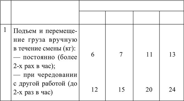 Подъем и перемещение тяжестей в пределах указанных норм допускаются, если это непосредственно связано с постоянно выполняемой профессиональной работой. В массу поднимаемого и перемещаемого груза включается масса тары и упаковки.