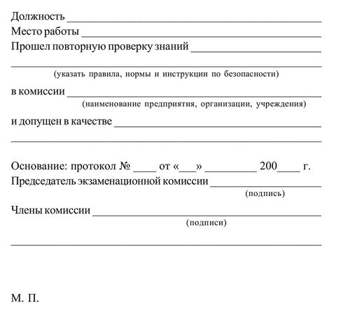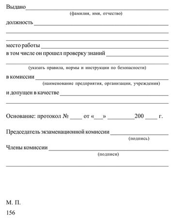 Лицам, сдавшим экзамены по правилам безопасности, выдаются удостоверения за подписью председателя и одного из членов комиссии. Удостоверение №____ о проверке знаний по технике безопасности