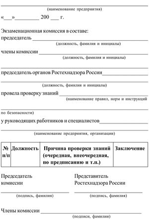 Согласно п. 5 указанного Положения проверка знаний правил безопасности у членов постоянно действующих комиссий учреждений проводится не реже одного раза в три года в Центральной экзаменационной комиссии Министерства образования и науки, в региональных комиссиях, созданных на базе вузовских, либо в комиссиях местных органов Федеральной службы по экологическому, технологическому и атомному надзору России (Ростехнадзор) или в учебных центрах и комбинатах, имеющих специальное разрешение (лицензию) органов Ростехнадзора России на проведение обучения и проверку знаний правил безопасности. Центральная экзаменационная комиссия Министерства образования и науки России формируется в соответствии с приказом Госкомвуза России, а региональные комиссии создаются и формируются на основании решений советов ректоров. Члены Центральной экзаменационной комиссии и региональных комиссий проходят проверку знаний правил безопасности не реже одного раза в три года в комиссиях органов Ростехнадзор или в специализированных организациях (учебных центрах, комбинатах, институтах), имеющих разрешения органов Ростехнадзора России на проведение обучения и проверку знаний соответствующих правил безопасности. Члены региональных экзаменационных комиссий могут также проходить проверку знаний правил безопасности в Центральной экзаменационной комиссии Министерства образования и науки России п. 6 вышеуказанного Положения. Состав экзаменационной комиссии учреждения формируется из специалистов, соответственно профилю имеющихся в учреждении объектов и оборудования, подконтрольных Ростехнадзору, и специальности экзаменуемых. В состав комиссий включаются главные инженеры, главные механики, главные энергетики, главные конструкторы, руководители отделов охраны труда, главные технологи и другие ведущие специалисты данного учреждения по усмотрению его руководителя, и в необходимых случаях представители региональных органов Ростехнадзора (по согласованию с ними). Постоянно действующие экзаменационные комиссии учреждений должны возглавлять руководители учреждений или их заместители. Состав постоянно действующих комиссий утверждается приказом руководителя учреждения. Организация и проведение проверки знаний у руководящих работников и специалистов учреждений возлагается на руководителей этих учреждений. Проверка знаний проводится по графику, утвержденному руководителем учреждения. В учреждениях перед проверкой знаний должны проводиться тематические консультации, лекции, семинары, курсы и другие учебные мероприятия. Проверка знаний правил безопасности у вновь поступивших на работу проводится не позднее одного месяца после назначения их на должность.