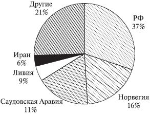 В 2000 г. прогнозируемый уровень зависимости от импорта к 2010 г. составлял 80% [78] , но этот уровень был достигнут уже к 2005 г. Здесь следует учесть падение производства и добычи нефти на Северном море и постепенный переход Великобритании из экспортера в импортера нефти. В импорте нефти 2005 г. (рис. 5.6) Россия и страны СНГ составляют наибольший процент за счет рынков Восточной Европы. Далее следуют Норвегия, Саудовская Аравия, Ливия и Иран. Около 1/3 нефти перепродается на спотовых рынках. Чаще всего данная нефть перевозится танкерами из стран Персидского залива и Африки и еще до доставки на европейские терминалы меняет хозяина по нескольку раз. Это делает почти невозможным определить происхождение сырья.