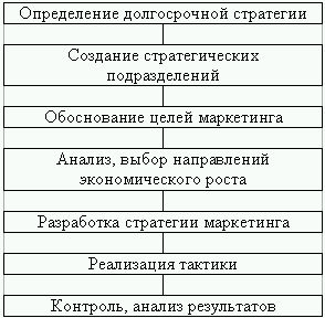 Процесс стратегического планирования включается в себя осуществление следующих взаимосвязанных и взаимодополняющих функций: определение долгосрочной стратегии; создание стратегических подразделений на предприятии; уточнение основных целей проведения маркетинговых исследований рынка; осуществление анализа и выбора направлений экономического роста; разработка основной стратегии маркетинга и планирование производства; выбор тактики и планирование способов и средств достижения поставленной цели; контроль, оценка и анализ основных результатов, возможное изменение стратегии предприятия.