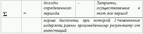 Внутренний коэффициент окупаемости – представляет собой точную ставку процента от инвестиций, которую в течение срока их действия используют для дисконтирования всех поступающих потоков денежной наличности от капитальных вложений, чтобы приравнять приведенную стоимость денежных поступлений к приведенной стоимости денежных расходов.