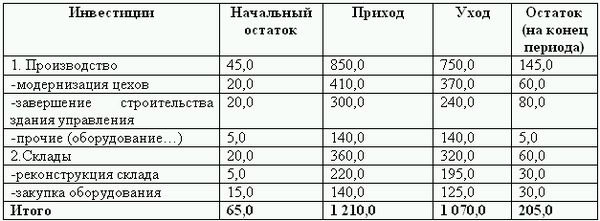 Главная цель инвестиционного бюджета – это выявление и планирование инвестиционного остатка денежных средств, который формируется с целью осуществления эффективных краткосрочных вложений. Этот вид денежных активов может формироваться при условии полного удовлетворения потребности предприятия в формировании денежных активов других видов. При формировании эффективного портфеля краткосрочных финансовых инвестиций денежные активы не теряют своей стоимости и их сумма не ограничивается.