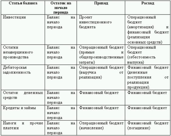 На основе отчетов о финансовых результатах, инвестициях и движении денежных средств, а также баланса на начало бюджетного периода строится проект баланса на конец бюджетного периода, основу которого составляет балансовое равенство по отдельным статьям актива и пассива: