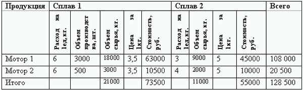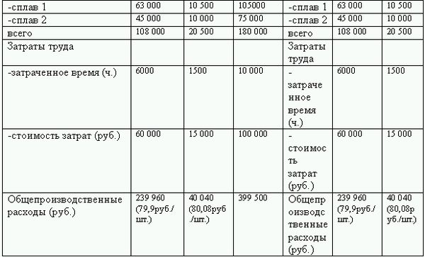 Планируемая стоимость прямых затрат: сплава 1–3,5 руб./кг., для сплава 2–5 руб./кг., труда производственных рабочих – 10 руб./ч.