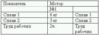 Данные о наличии сырья и готовой продукции на складе: сплав № 1 – 3500 кг., сплав № 2 – 3000шт.; мотор 1 – 50шт., мотор – 25шт.