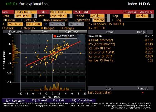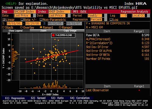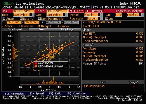 Как видно из нижеприведенной графической выборки, представленной на основании данных Bloomberg, волатильность рынка (коэффициент β рассчитывался к индексу MSCI EM, который использовался в качестве опорного графика) оказалась напрямую связана с уровнем внутренних инвестиций в этот рынок. Чем он был выше, тем волатильность представлялась ниже, и наоборот. Так, в Китае с начала 2002 года пенсионным фондам разрешено инвестировать до 40% своих активов в фондовый рынок Поднебесной (расчетная волатильность китайского индекса Shanghai & Shenzhen Composite с сентября 2006 г. оказалась на 20% ниже волатильности РТС, даже несмотря на массовый исход западных фондов с китайского рынка с начала 2008 года). В Бразилии лишь с осени 2007 года пенсионные фонды активизировали свое участие в Bovespa, повысив долю средств, инвестированных в акции бразильских компаний всего до 35% и впервые сравнявшись по уровню с иностранными институциональными инвесторами и фондами. Как следствие – довольно высокие значения волатильности бразильского индекса налицо. В ЮАР в виду ее колониального прошлого пенсионные фонды были всегда традиционно активны на местном фондовом рынке, и даже с приходом к власти чернокожих африканских лидеров Нельсона Манделы и Табо Мбеки ситуация осталась прежней. Результат – низкие значения волатильности индекса FTSE/JSE.