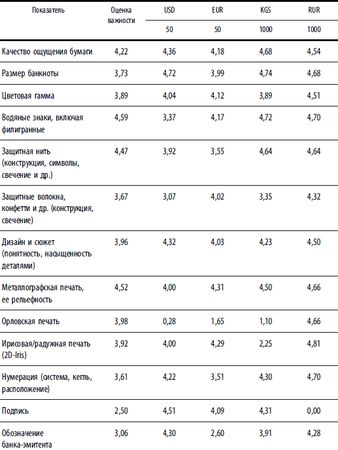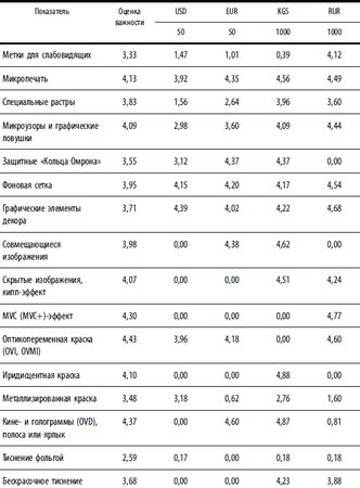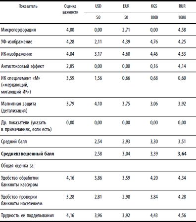 К оцениваемым показателям были добавлены еще три – фоновая сетка, защитные "Кольца Омрона" и антистоксовый эффект (таким образом, оценивалось уже 35 показателей) – и учтены усовершенствованные признаки. Кроме того, оценивалось и удобство проверки банкнот населением (табл. 1.1.8). Таблица 1.1.8. Результаты оценивания