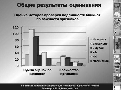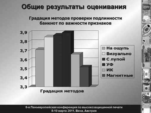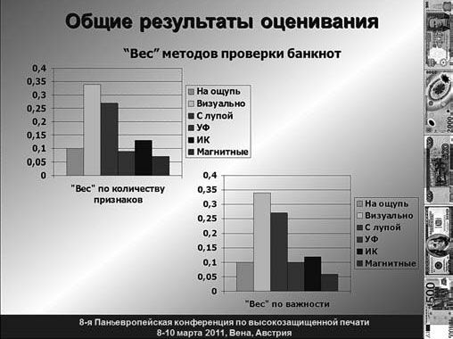 Такой результат вызывает интерес, поскольку многие кассиры считают, что в настоящее время "ультрафиолет" уже не является надежной защитой. Однако необходимо отметить, что комплексное применение различных видов УФ-защиты (бифлуоресцентных красок, сложных узоров, защитных волокон и т. д.) создает значительные трудности для фальшивомонетчиков, а сам способ проверки является достаточно простым, выразительным и недорогим.