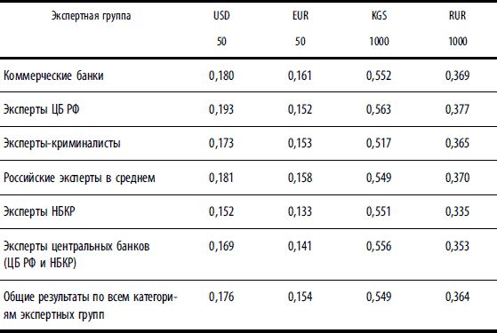 Разумеется, проведенные исследования не ограничиваются теми данными, которые мы увидели в книге. Рассмотренные три раунда оценивания качества банкнот дали богатый фактический материал для анализа мнений экспертов в различных экспертных группах и в целом (табл. 1.1.10).