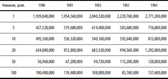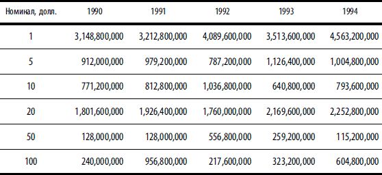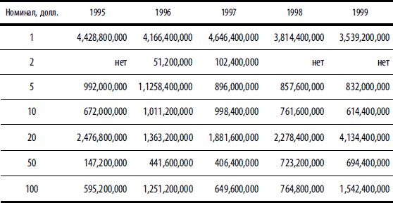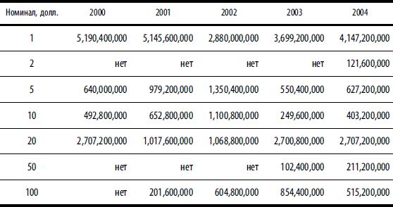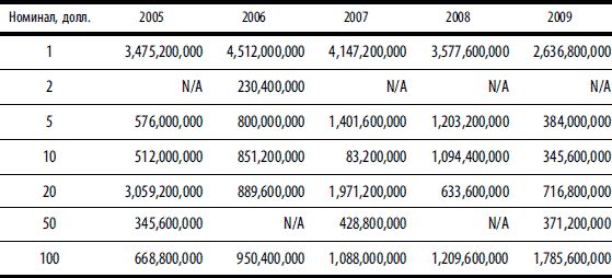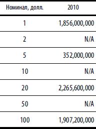 Примечание. Объемы производства (в шт.) приведены по данным Бюро гравирования и печати США (www.moneyfactory.gov) по финансовым годам. Финансовый год в США начинается 1 октября и завершается 30 сентября следующего года.