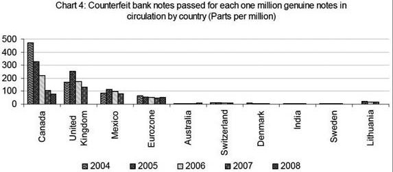 В соответствии с международной практикой уровень фальшивомонетничества оценивается по количеству фальшивых банкнот, выявленных в банковской системе страны, на 1 млн банкнот в обращении. На рис. 1.2.2 приведены данные из обзора Банка Канады "Информация о распространенности фальшивомонетничества в Канаде и его влиянии на непосредственно потерпевших и на общество" ("Information on the prevalence of counterfeiting in Canada and its impact on direct victims and society") для некоторых стран мира.