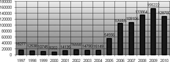 Важной характеристикой наличного денежного обращения является количество и динамика изменения числа выявленных поддельных денежных знаков. По данным Банка России (www.cbr.ru), в 2010 г. в банковской системе России было выявлено, изъято из оборота и передано в органы внутренних дел 128 700 поддельных банкнот и монет Банка России. Как видно из диаграммы рис. 1.2.1, после резкого возрастания в 2005–2006 гг. положение несколько стабилизировалось. Однако стабилизировалось оно на уровне, почти 10-кратно превышающем относительно "спокойные" предыдущие годы, чему способствовал и финансовый кризис.