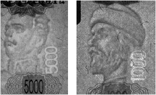 Водяной знак может быть общим (непрерывно повторяющимся знаком, рисунком или узором по всей площади банкноты) или локальным (с рисунком, расположенным в определенном месте). Он появляется в процессе изготовления подложки и представляет собой изменение ее толщины. В зависимости от толщины существуют несколько видов водяных знаков: двухтоновые светлые (толщина знака меньше толщины полотна подложки) и темные (толщина знака выше толщины полотна подложки); трехтоновые (сочетание светлых и темных элементов, рис. 1.2.11, слева) и многотоновые (различная плотность знака по отношению к плотности бумаги). Последние получают на круглосеточных бумагоделательных машинах из бумаги высшего качества, поэтому применяются они как локальные для банкнот высоких номиналов, представляют собой сложные изображения (портреты, здания, фрагменты памятников и т. д., рис. 1.2.11, справа) и наносятся на купонных полях.