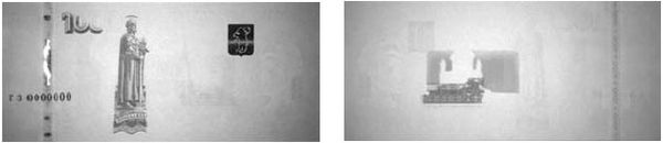 Особенностью ИК-защиты 1000-рублевой банкноты модификации 2010 г. является то, что благодаря применению специальной краски изображение храма на оборотной стороне банкноты выглядит светлым на фоне темного неба (рис. 1.2.57, справа).