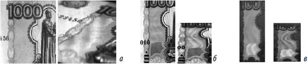 При рассматривании банкноты перпендикулярно направлению взгляда поле MVC выглядит однотонным, тогда как при рассматривании под острым углом на нем возникают многоцветные радужные полосы. При необходимости на этом поле могут быть сформированы и символы или буквы. В 1000-рублевой банкноте модификации 2010 г. применен усовершенствованный защитный признак – MVC+ (рис. 1.2.54, б и в).