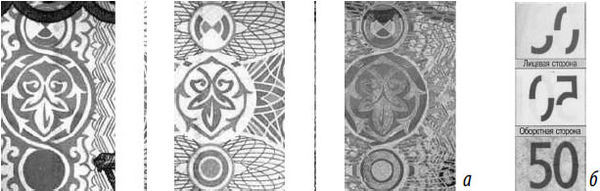 На российских рублях до их модификации в 2004 г. неокрашенные элементы вертикально расположенного многоцветного орнамента на просвет заполняются цветом фрагментов противоположной стороны (рис. 1.2.52, а).