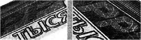 В банкнотах разных стран, включая Россию, широко применяются ИК-метамерные краски , когда часть изображения, выглядящего как единое в видимом спектре, пропадает при наблюдении в инфракрасном (ИК) диапазоне (рис. 1.2.57). Инфракрасная защита – один из наиболее надежных и широко распространенных способов защиты банкнот и ценных бумаг от подделки. Это связано с тем, что нанесение специальной краски с метамерными свойствами является достаточно сложным и дорогостоящим процессом. Кроме того, сложной операцией является и приводка – совмещение части изображения, нанесенного обычной краской, с изображением, нанесенным специальной краской.