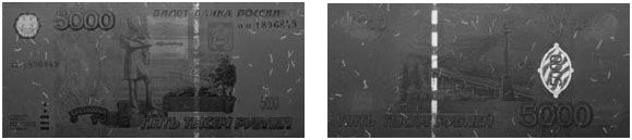 УФ-образ банкноты номиналом 5000 руб. отличается тем, что узор на обороте банкноты светится двумя цветами – красным и зеленым (рис. 1.2.55, справа).