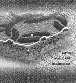 Металлографская печать ("интаглио" или "инталия" – печать с гравюры) осуществляется с металлических печатных форм с выгравированными на них узорами или рисунками, также на специальных печатных прессах и под очень большим давлением (около тонны на кв. см). Этот способ позволяет создавать изящные гильоширные (по имени французского изобретателя Гильоша) узоры из тонких линий (розетки, сетки, ассюре, бордюры и др.), рисунок становится рельефным, и можно даже получать многотоновые изображения при однокрасочной печати – оттенок меняется за счет изменения толщины красочного слоя. Процесс также является очень сложным и дорогостоящим, что затрудняет его подделку.
