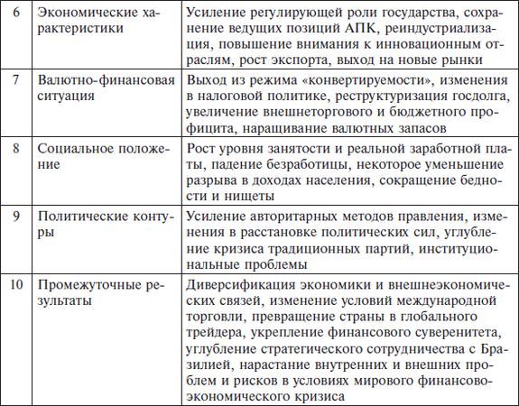 В целом можно констатировать, что аргентинская экономика находится в процессе формирования новой кризисоустойчивой модели, при которой главными двигателями роста должны быть: а) расширение внутреннего спроса (прежде всего потребительского, но также и инвестиционного); б) экспортная экспансия и в целом географическая и товарная диверсификация внешней торговли.